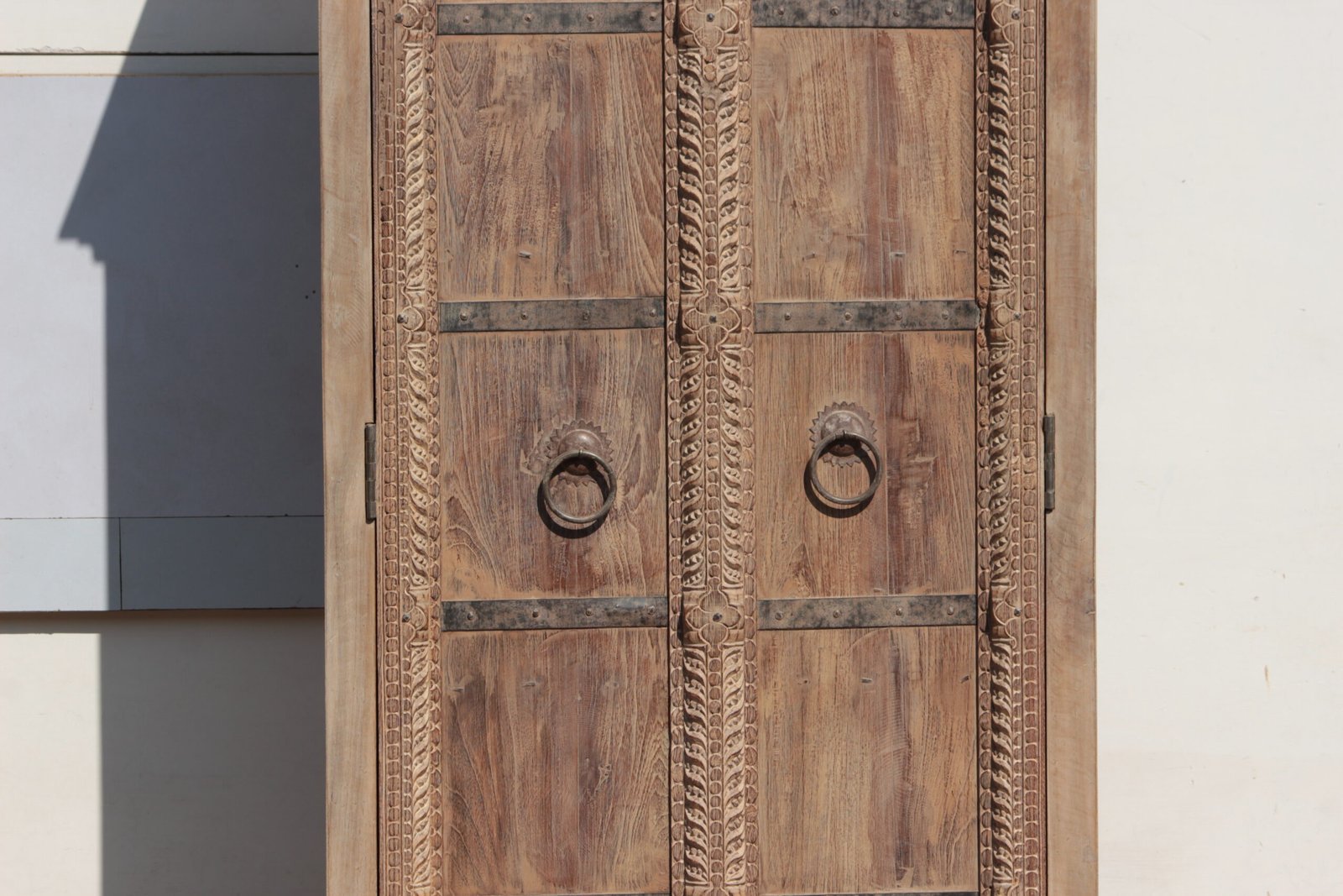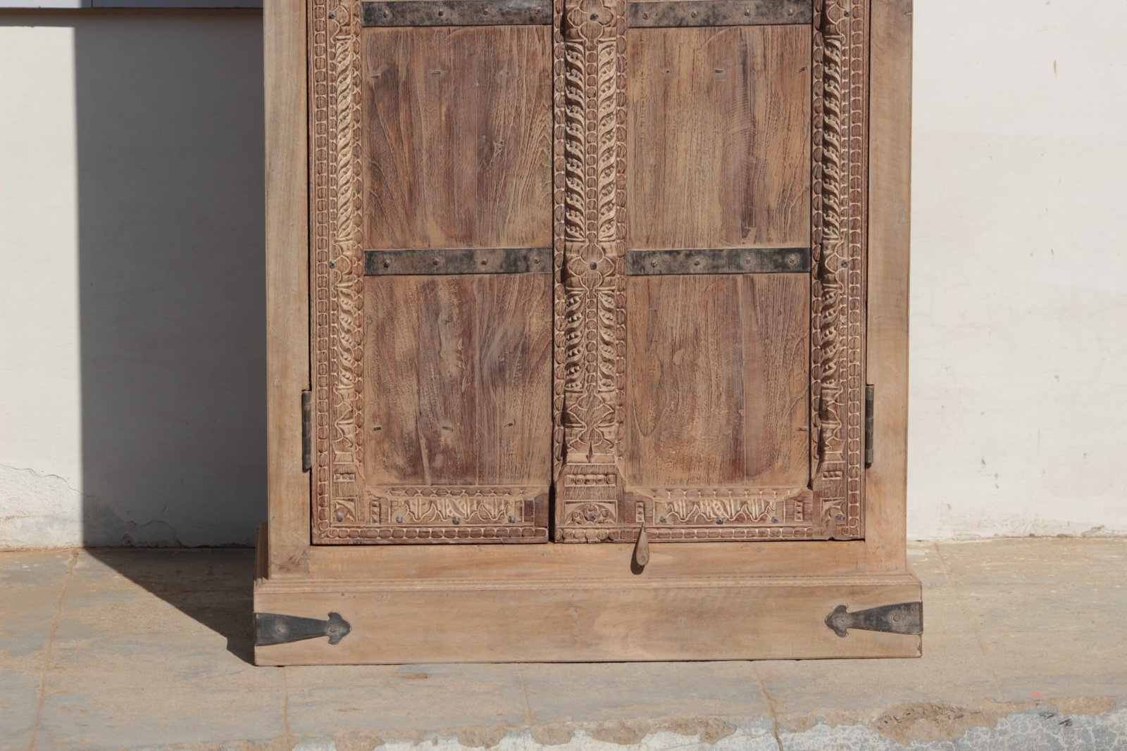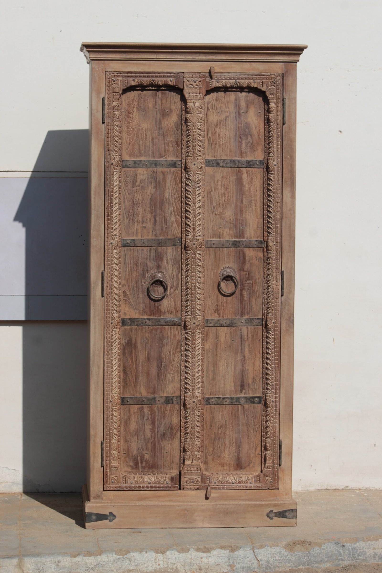 This beautifully handmade Indian almirah cupboard/ wardrobe has been handcrafted engraved wooden pieces, with metal adornments and a distressed finish.