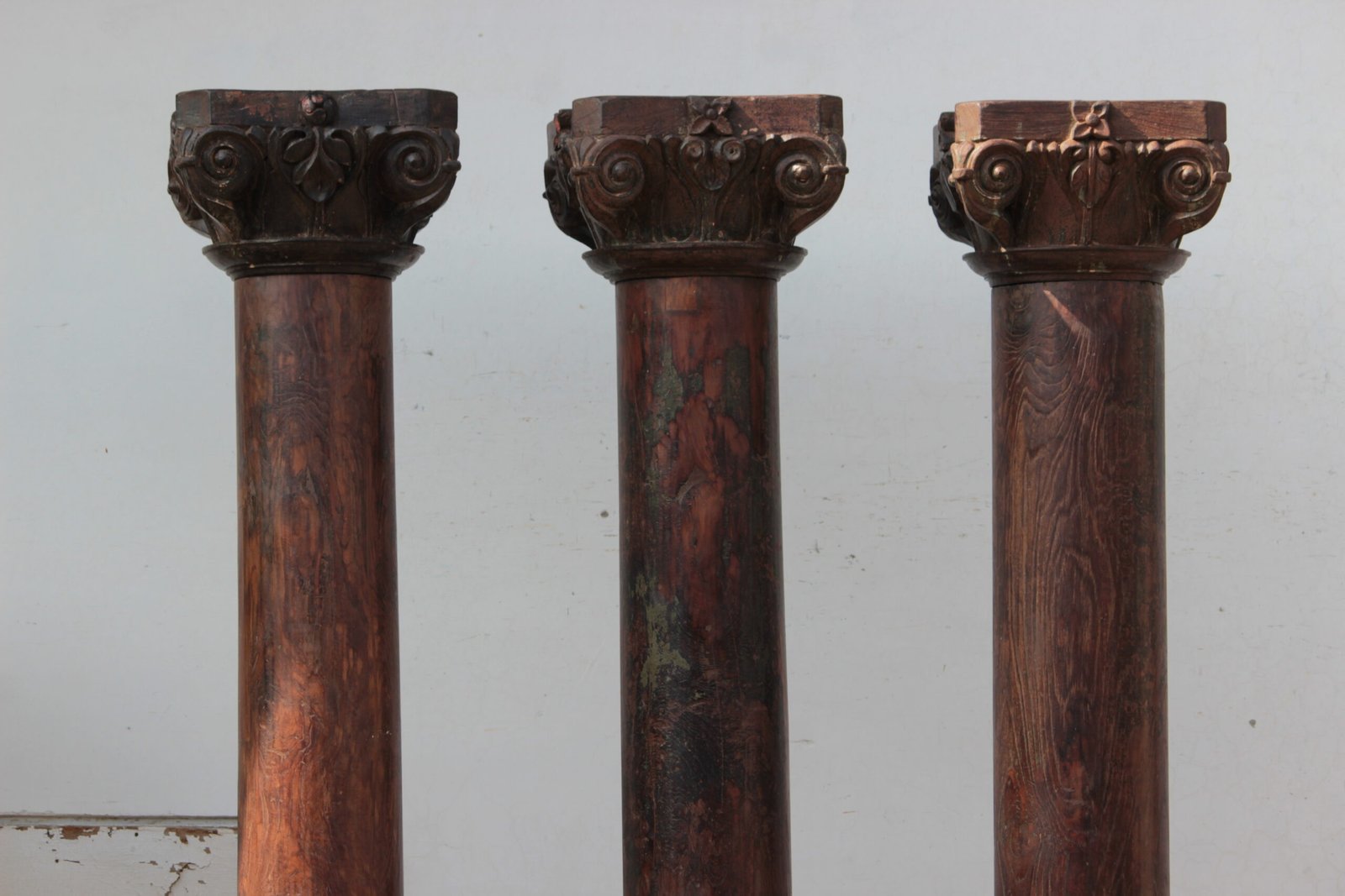 This unique set of 3 architectural carved wood columns with decorative stone bases comes from mid-19th-century India. The lovely aged aquamarine green color detailing gives these columns an old-world appeal.