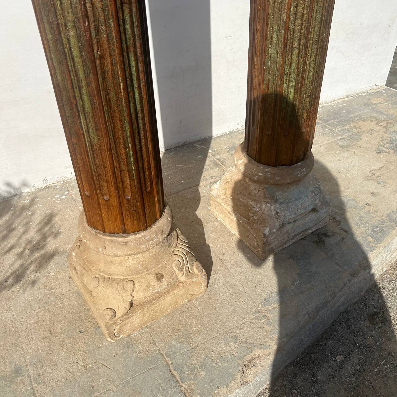 These antique Indian teakwood Stambh or pillars, in the neoclassic style, with fluted columns resting on stone plinths, and topped with carved tops and capitals capitals, and with a great natural teak patina finish. From Rajasthan.