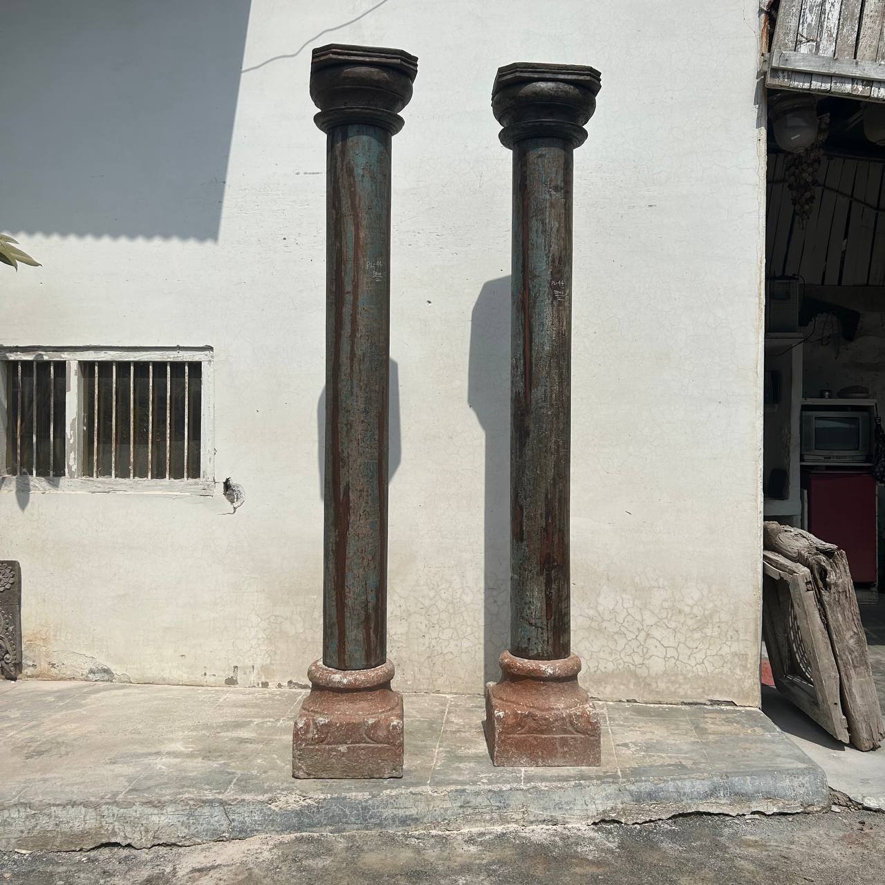 The pillars have been salvaged from an old building in Gujarat State and saved for future generations! They have lots of the fantastic old paint with fabulous patina built up over centuries. They can be used as the grand entrance in to a courtyard or patio area, as well as architectural features internally. They are in amazing condition & are VERY heavy. The teak is solid, and the pillars sit on fine limestone heavy bases.