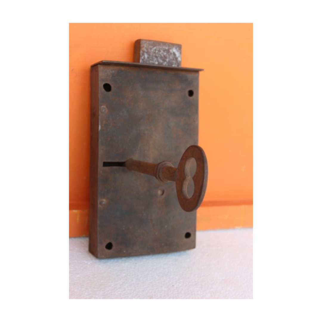 Step back in time with this extraordinary antique door lock and key, a true gem for collectors and history enthusiasts. This imposing iron lock, crafted with intricate detailing and robust construction, dates back to a bygone era, showcasing the craftsmanship and artistry of its time.