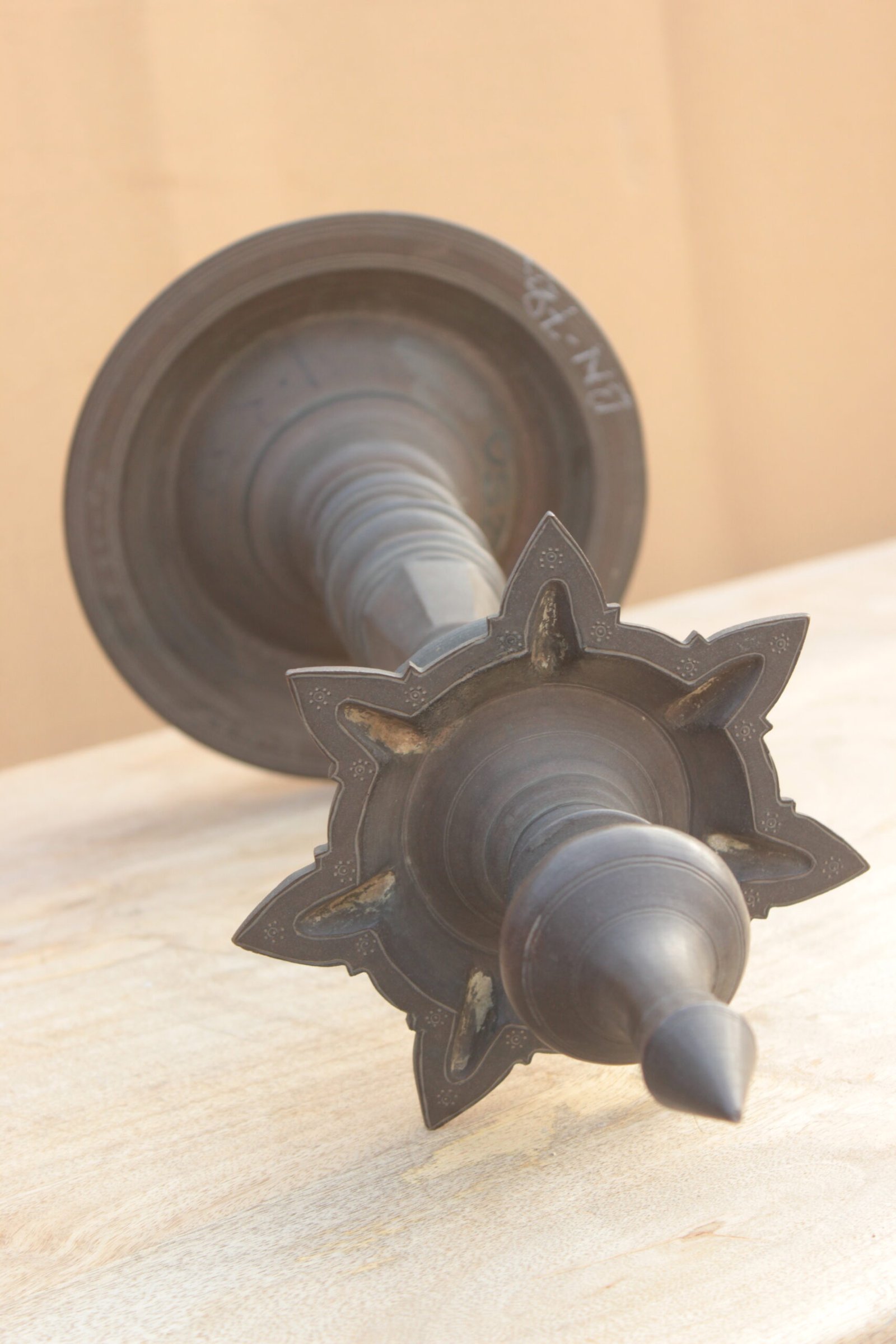 The lamp features the iconic silhouette characteristic of authentic Kerala oil lamps. It is composed of four distinct, expertly turned sections: