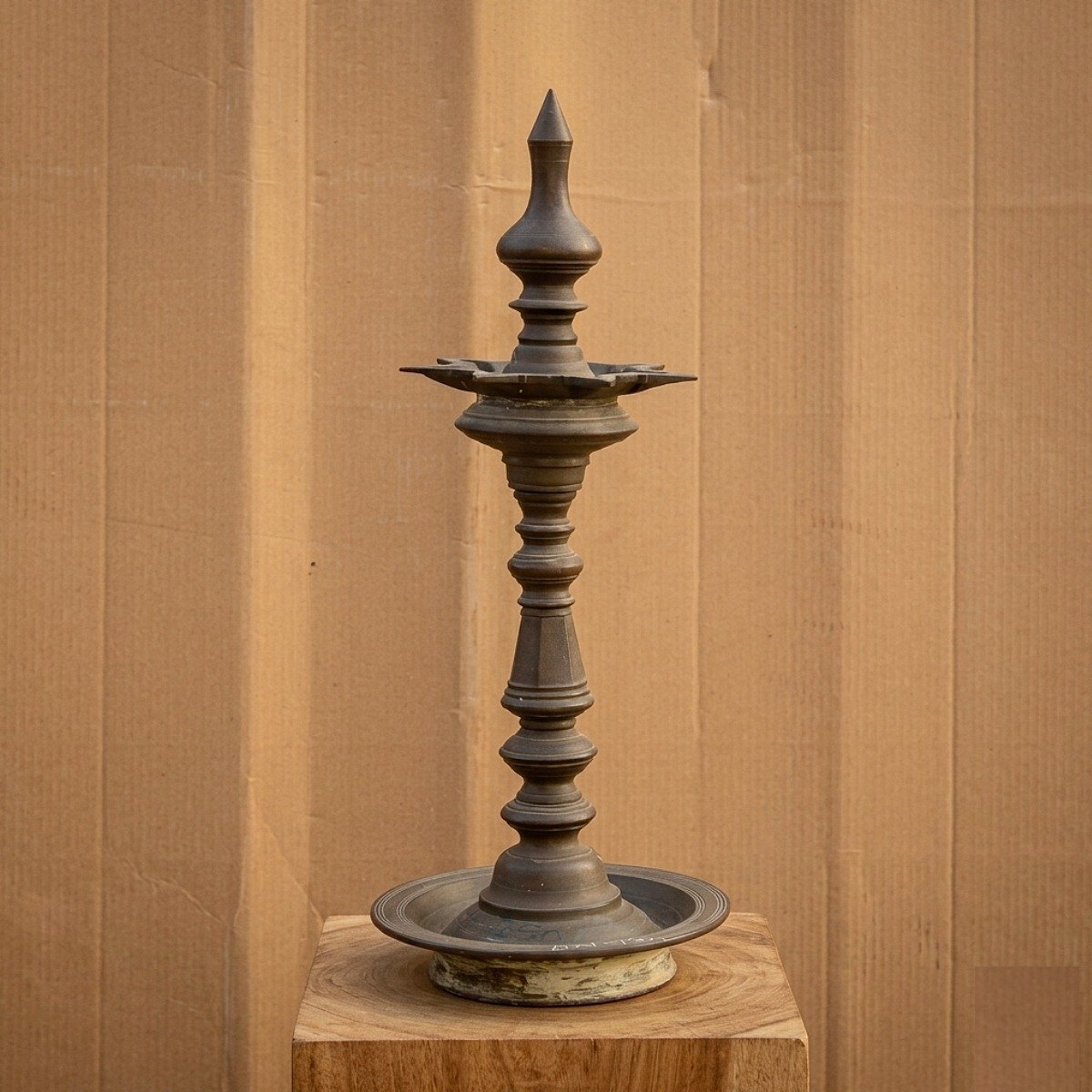 This authentic, heavy-gauge Kerala lamp is a magnificent example of South Indian craftsmanship. Hand-cast from solid brass, it features the traditional four-tier silhouette with a deep oil reservoir and a beautifully sculpted finial