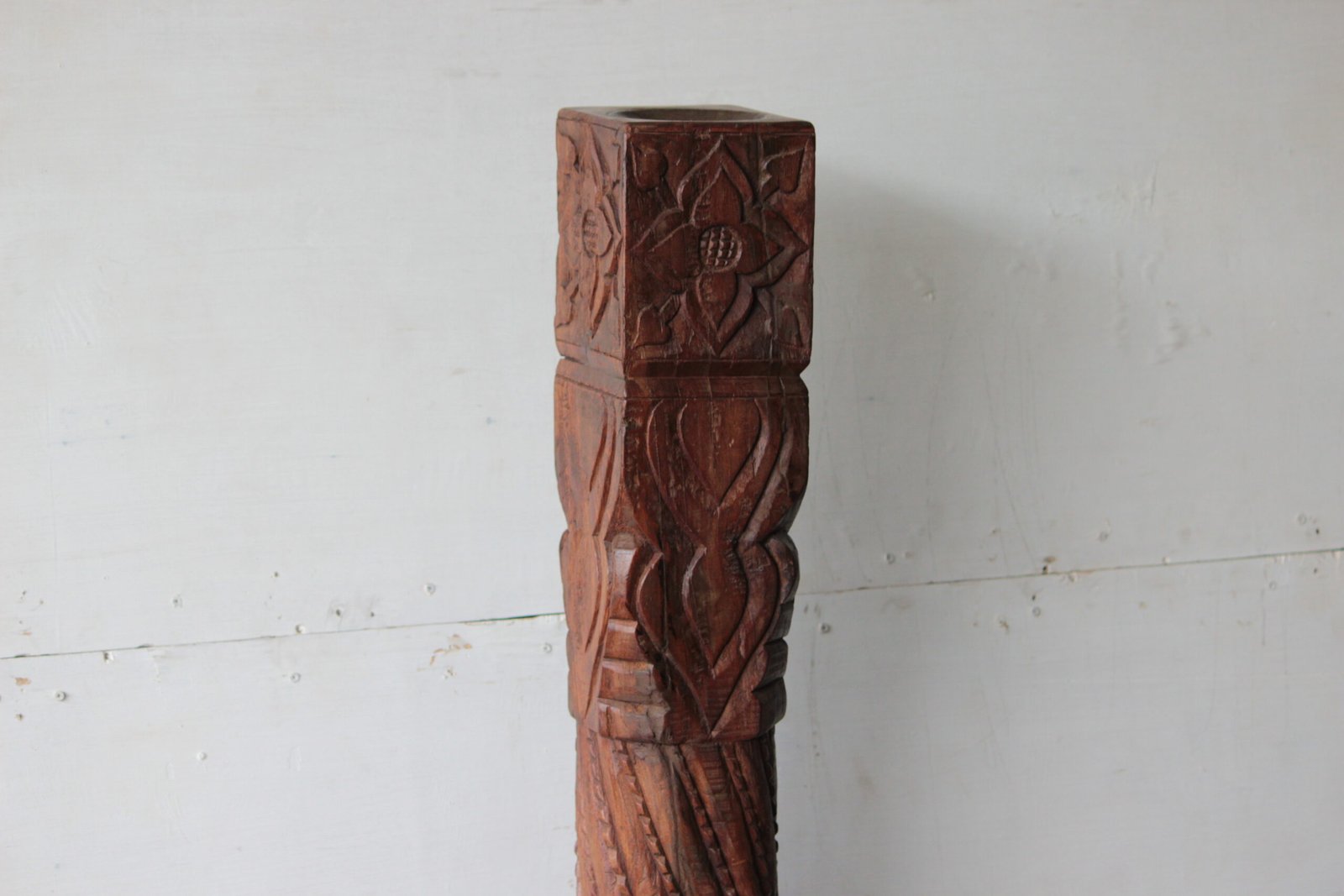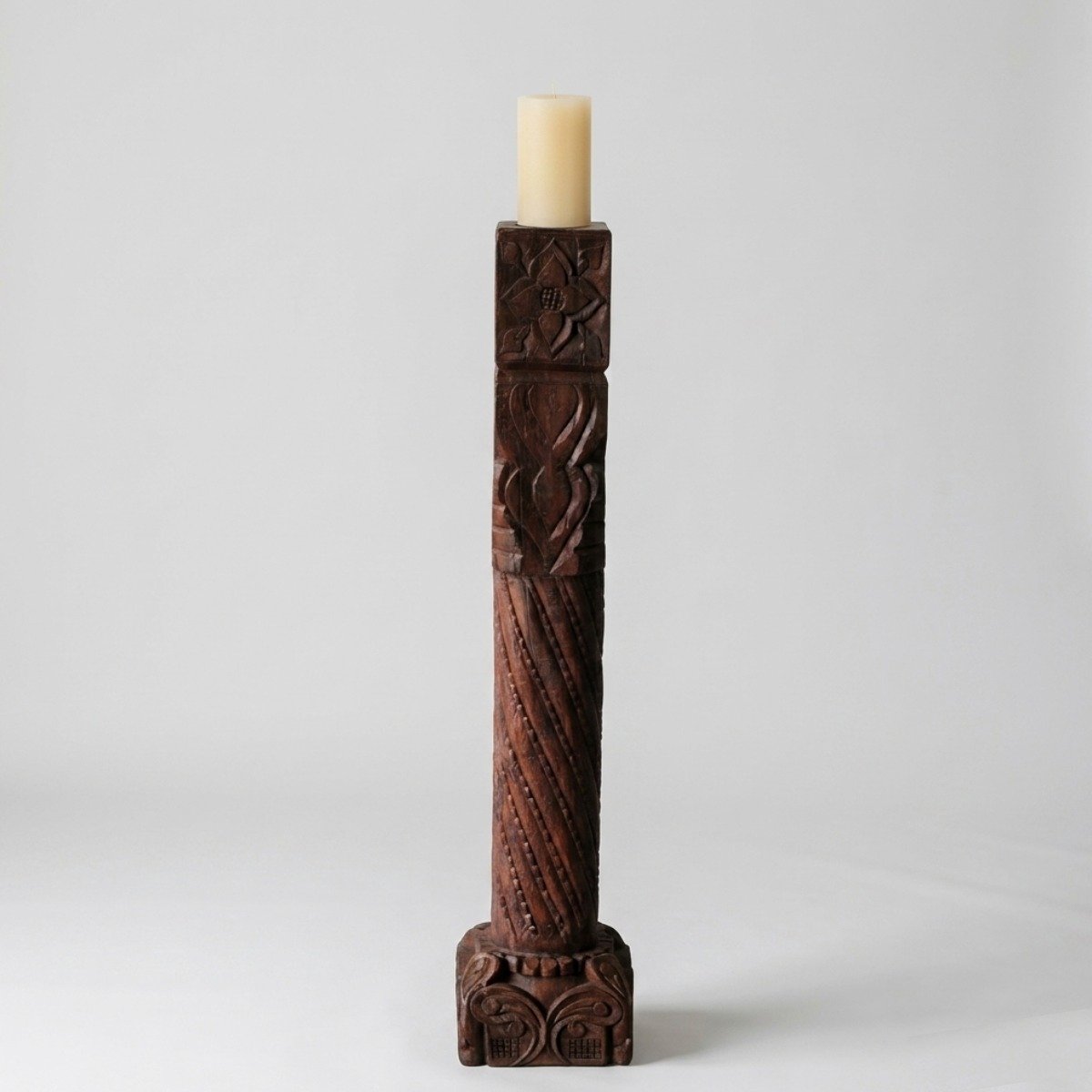 The Capital (Top): A square block featuring a deeply recessed lotus flower or rosette motif on each face. This serves as a sturdy platform for large pillar candles or small sculptures.