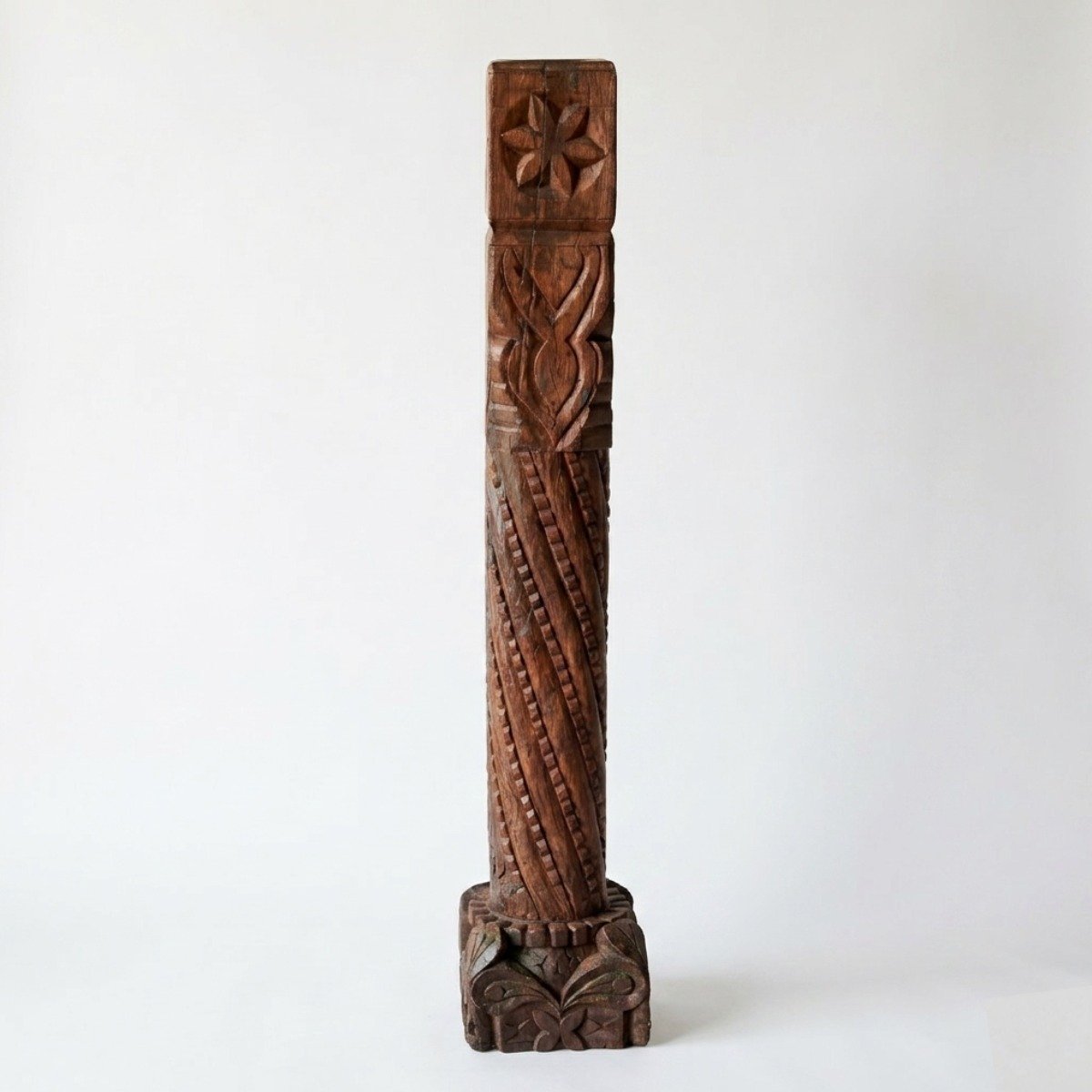 This hand-carved wooden pillar is a striking example of rustic architectural decor, blending traditional craftsmanship with a substantial, grounded presence. Standing at an impressive 3.8 feet, it functions as a floor-standing statement piece.