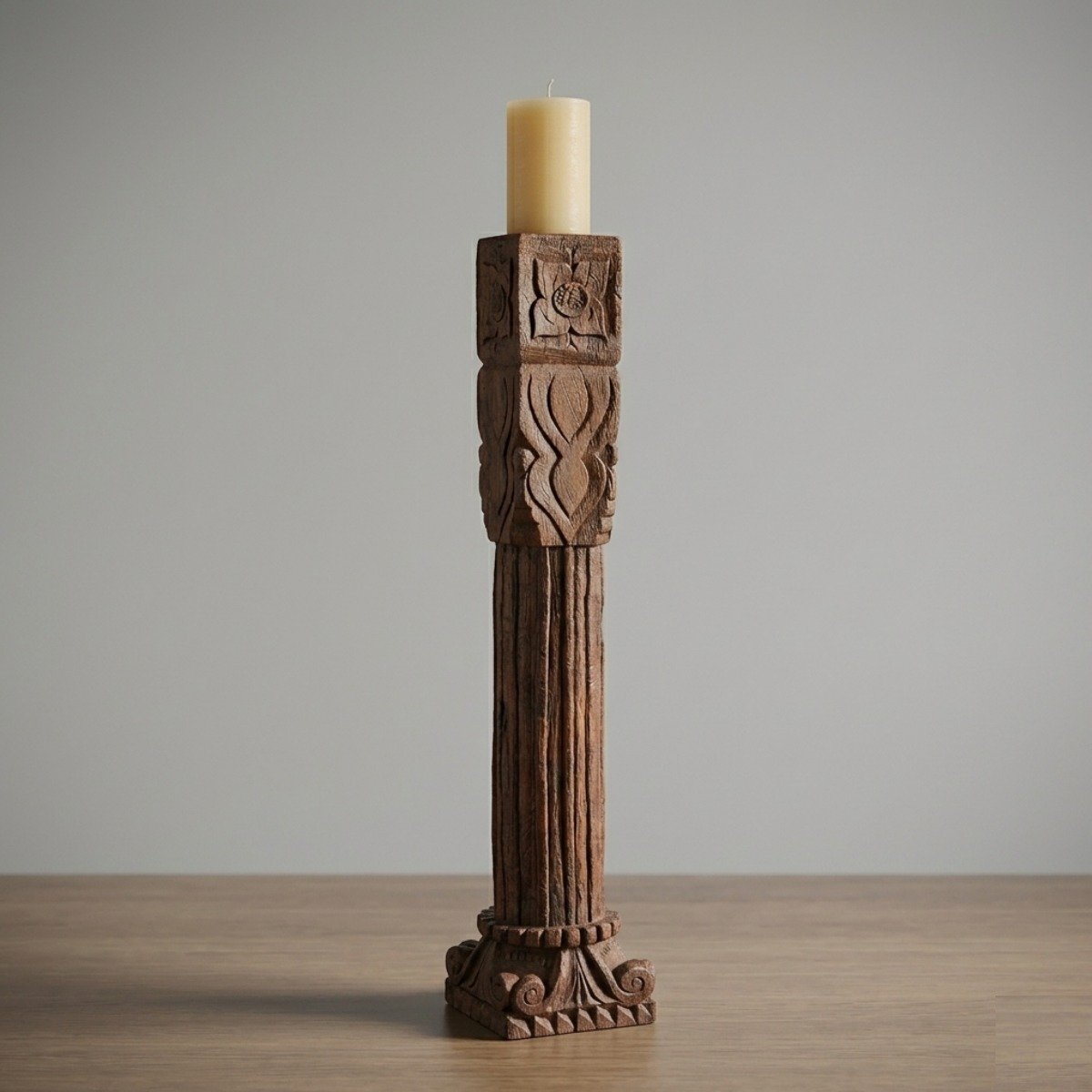 The Capital (Top): A square block featuring a deeply recessed lotus flower or rosette motif on each face. This serves as a sturdy platform for large pillar candles or small sculptures.