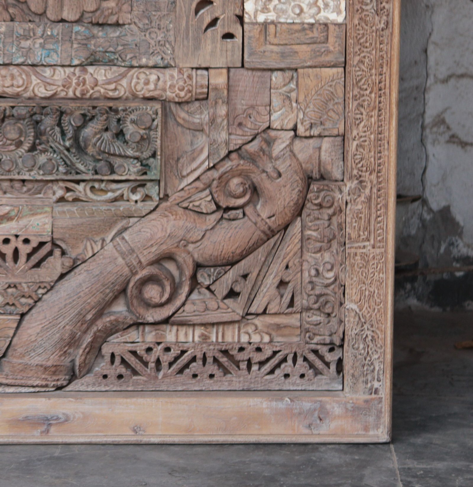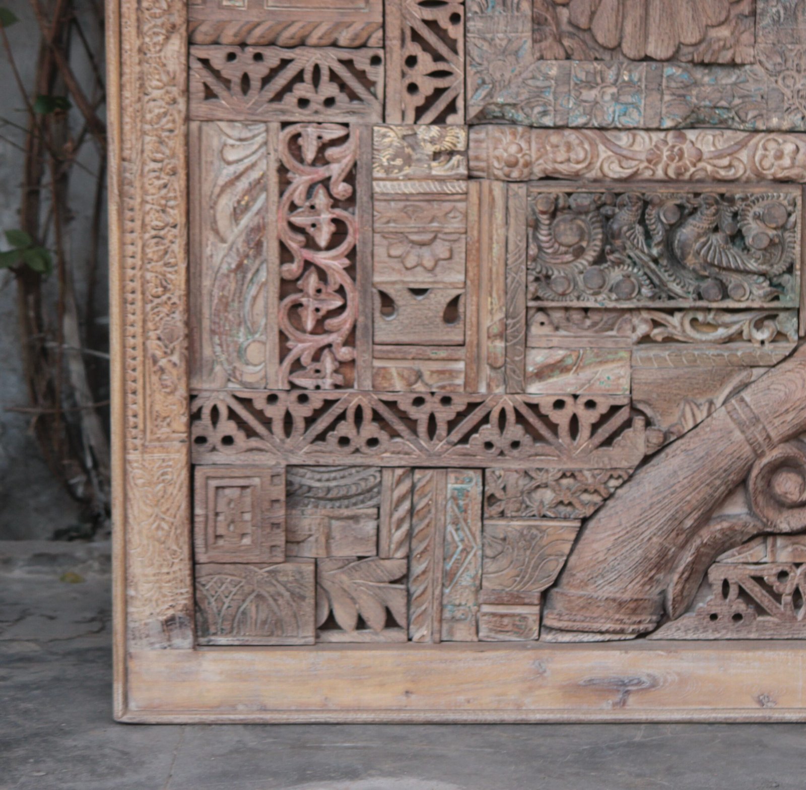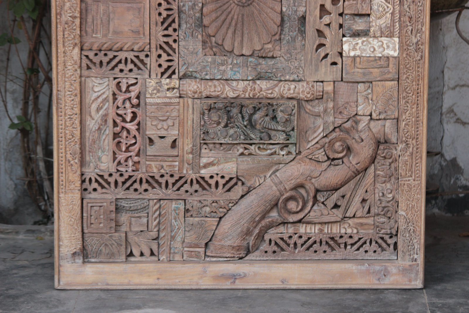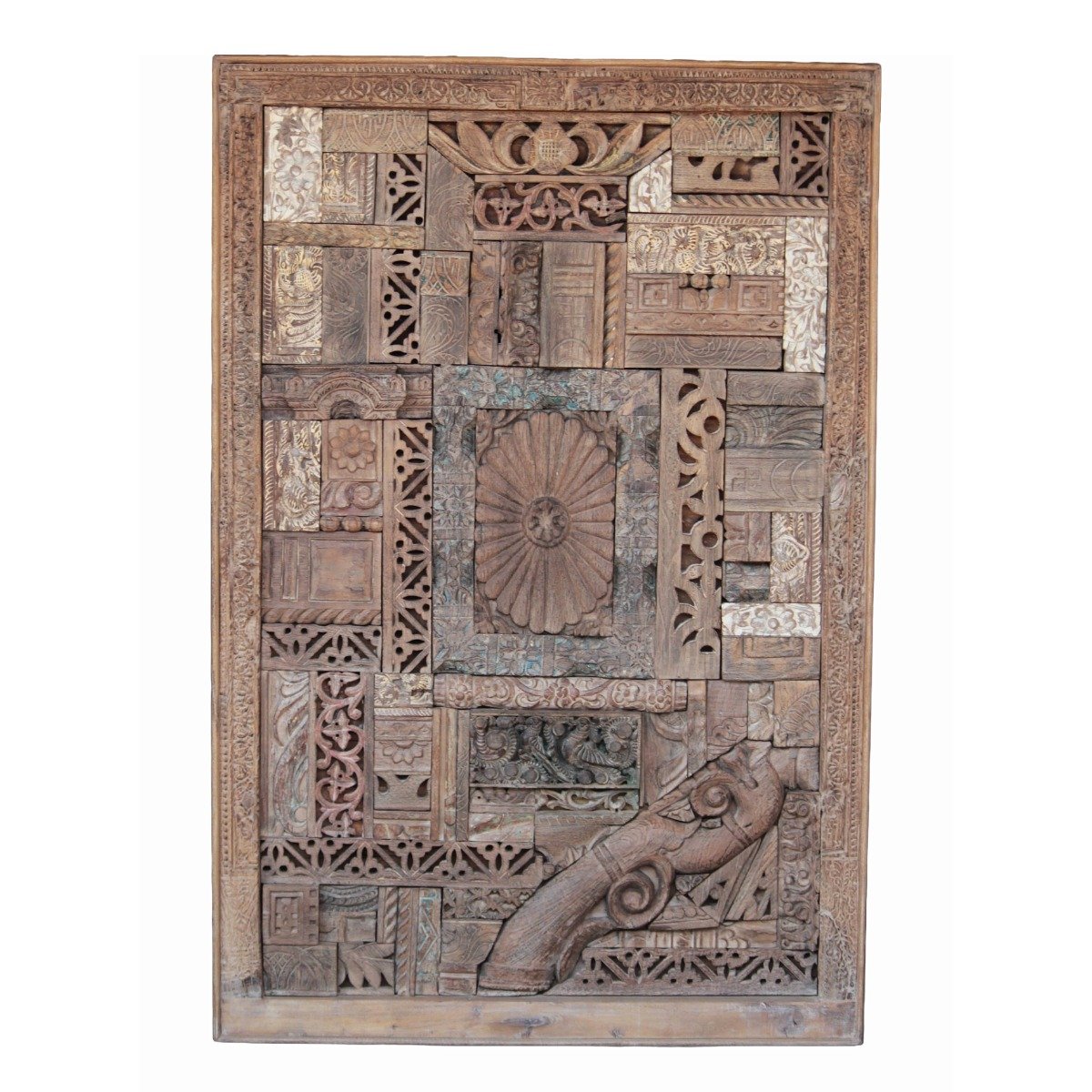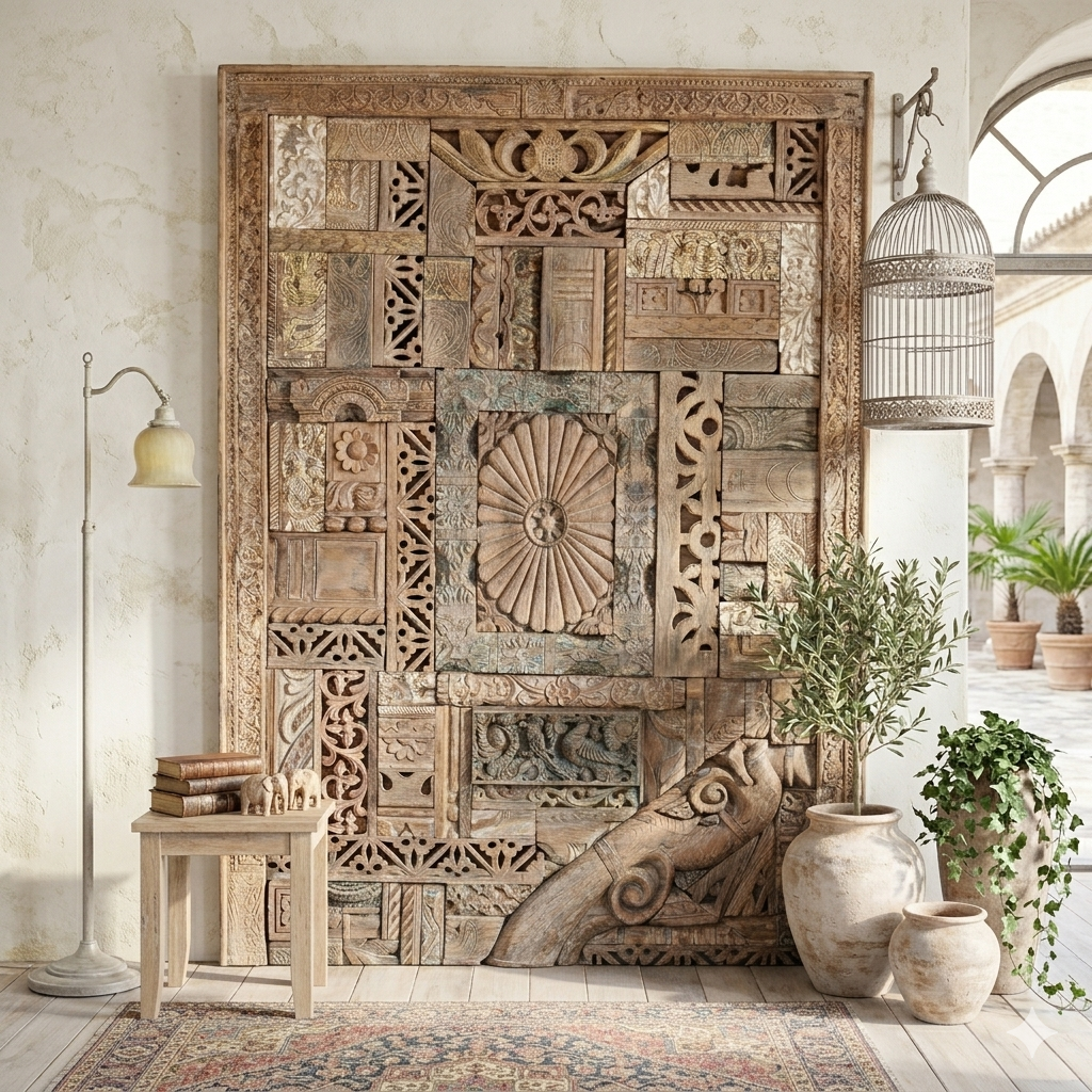 The Masterful Assembly of History: This panel is not merely an object; it is a curated collection of cultural artifacts. Meticulously handcrafted by master artisans in India, it is composed of countless individual, antique teak wood carving blocks. These blocks, originally used to hand-print intricate textiles across the subcontinent, have been salvaged from forgotten workshops, each bearing the wear and unique patina of its own industrious life. No two blocks are identical, making every panel a truly unparalleled work of art.