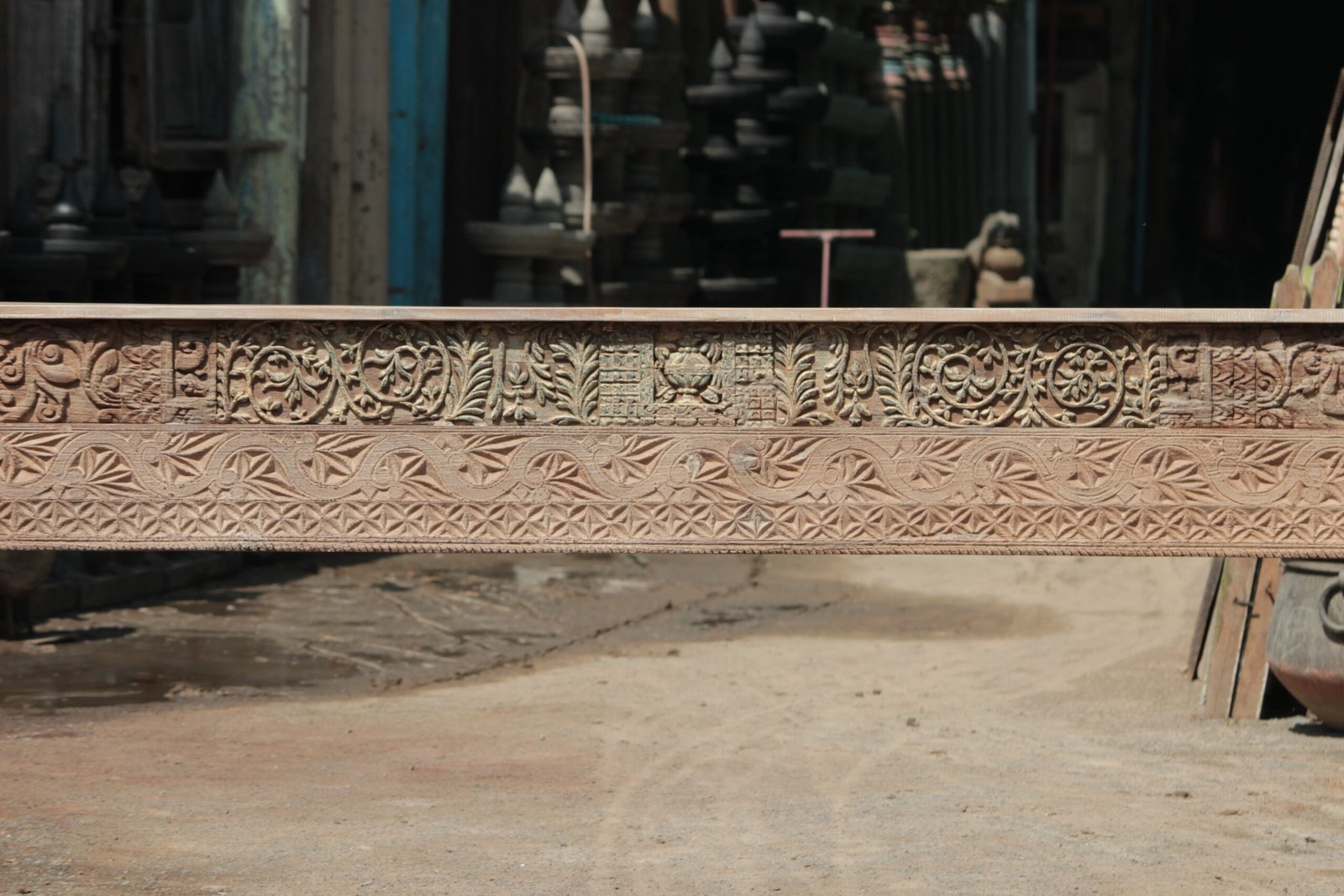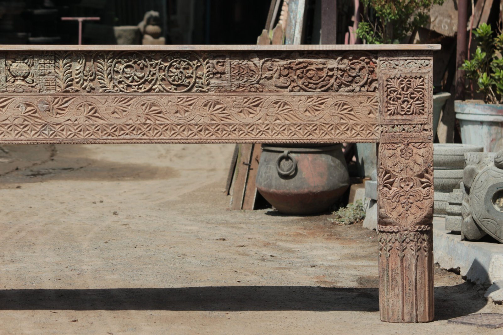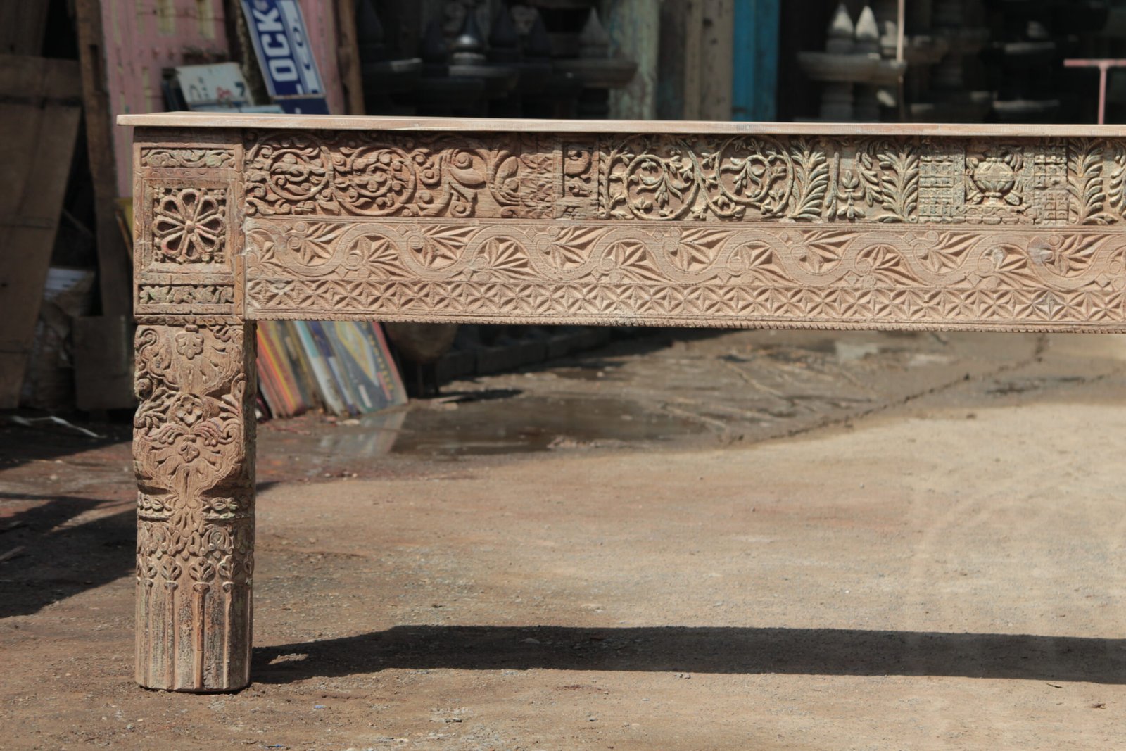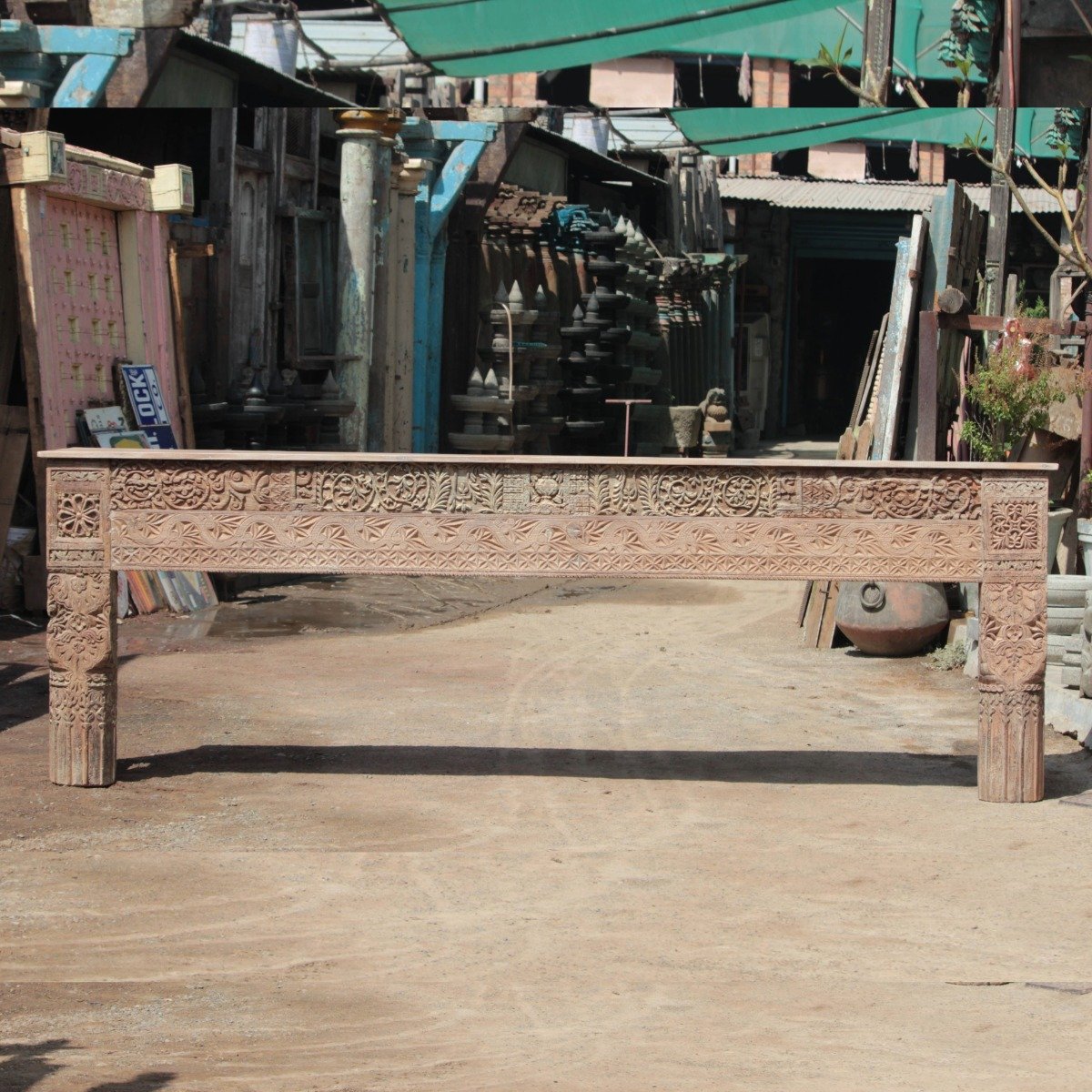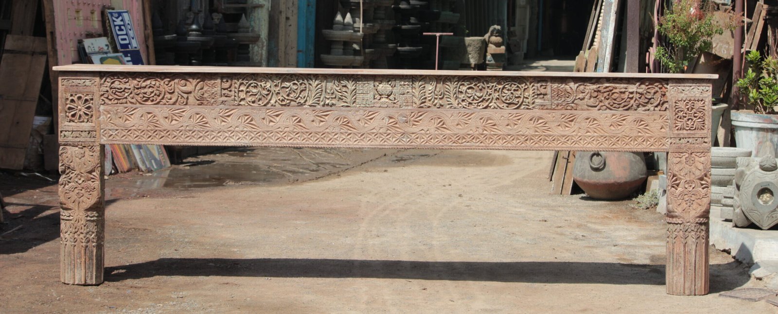 This 9 ft hand-carved reclaimed wooden console table is a perfect blend of rustic charm and timeless craftsmanship. Made from sustainably sourced reclaimed wood, it features unique textures, rich grains, and intricate artisan carvings that make each piece one of a kind. Its extra-long design offers ample space for décor, storage, or display, making it ideal for entryways, living rooms, or hallways. Durable, eco-friendly, and versatile, this console table adds warmth, character, and elegance to both modern and traditional interiors.