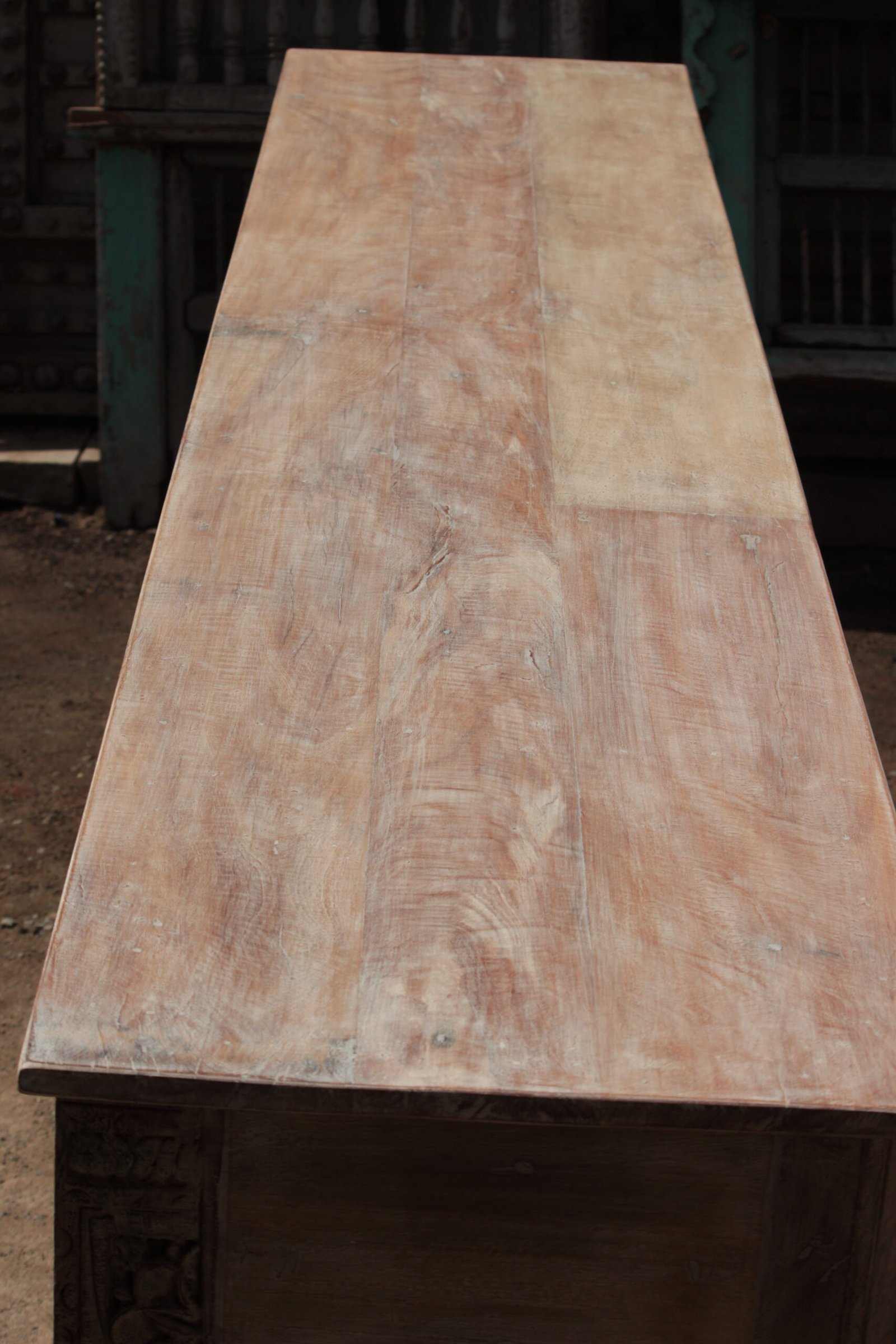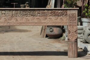 Overall, this 9 ft hand-carved reclaimed wooden console table seamlessly blends history with modern living, offering both functionality and timeless beauty.
