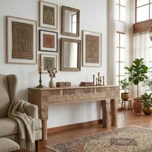 Incorporating this rustic yet elegant console table into a modern interior is surprisingly effortless. The key is balance. Pair the table with clean-lined furniture, neutral color palettes, and minimal décor to let its intricate carvings stand out as a focal point. You can style it with contemporary elements such as metallic vases, abstract art, or sleek table lamps to create a contrast between old-world craftsmanship and modern design.