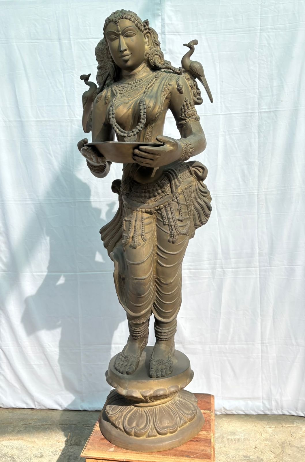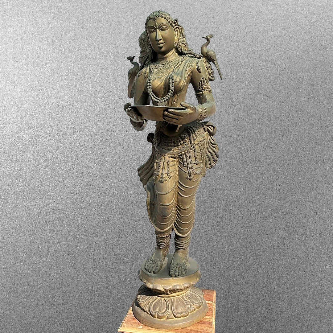 • Design: It features a female figure standing on a lotus base, holding a lamp (or diya) in her hands, often flanked by figures of birds such as peacocks on her shoulders.