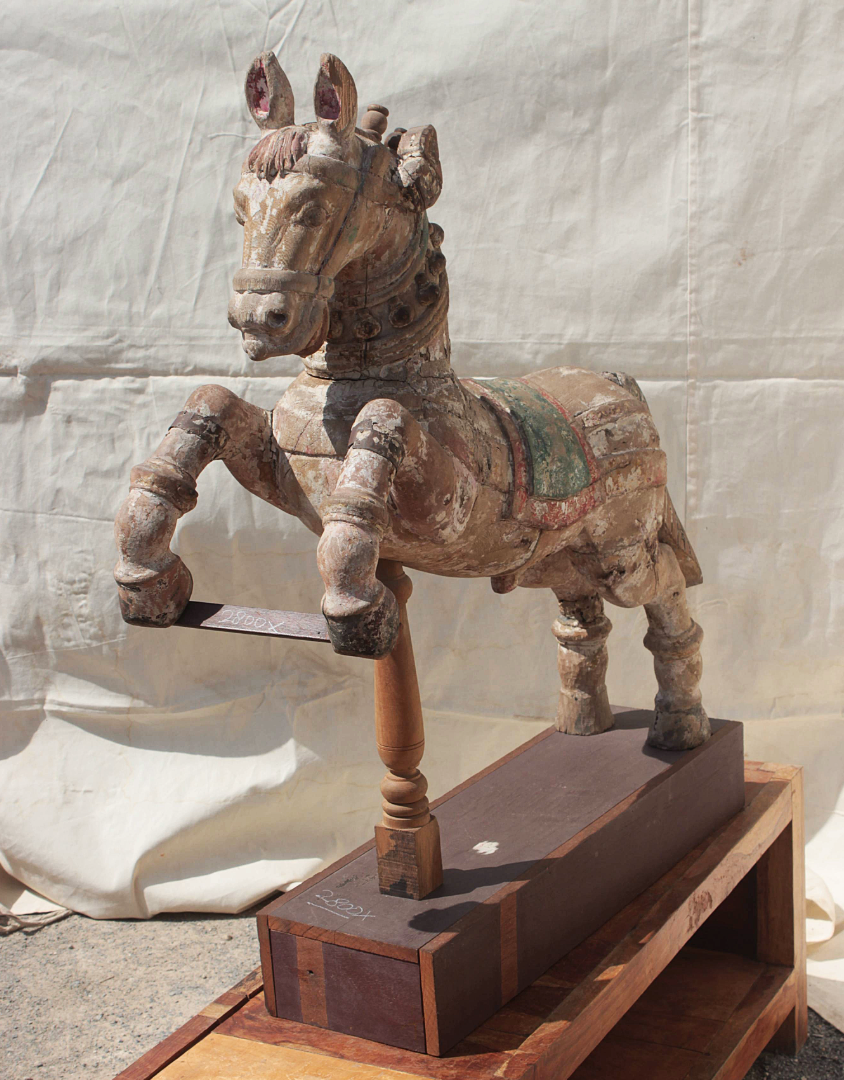 In Hindu temple traditions, many deities are believed to have a specific vahana that symbolizes their divine presence and attributes. The wooden temple horses are crafted with intricate details, sometimes adorned with jewelry and fabric, and they play a significant role in festivals and rituals, where they are paraded through the streets or around the temple precincts. These sculptures not only have religious significance but also showcase the skill of traditional artisans in carving and sculpting wood.