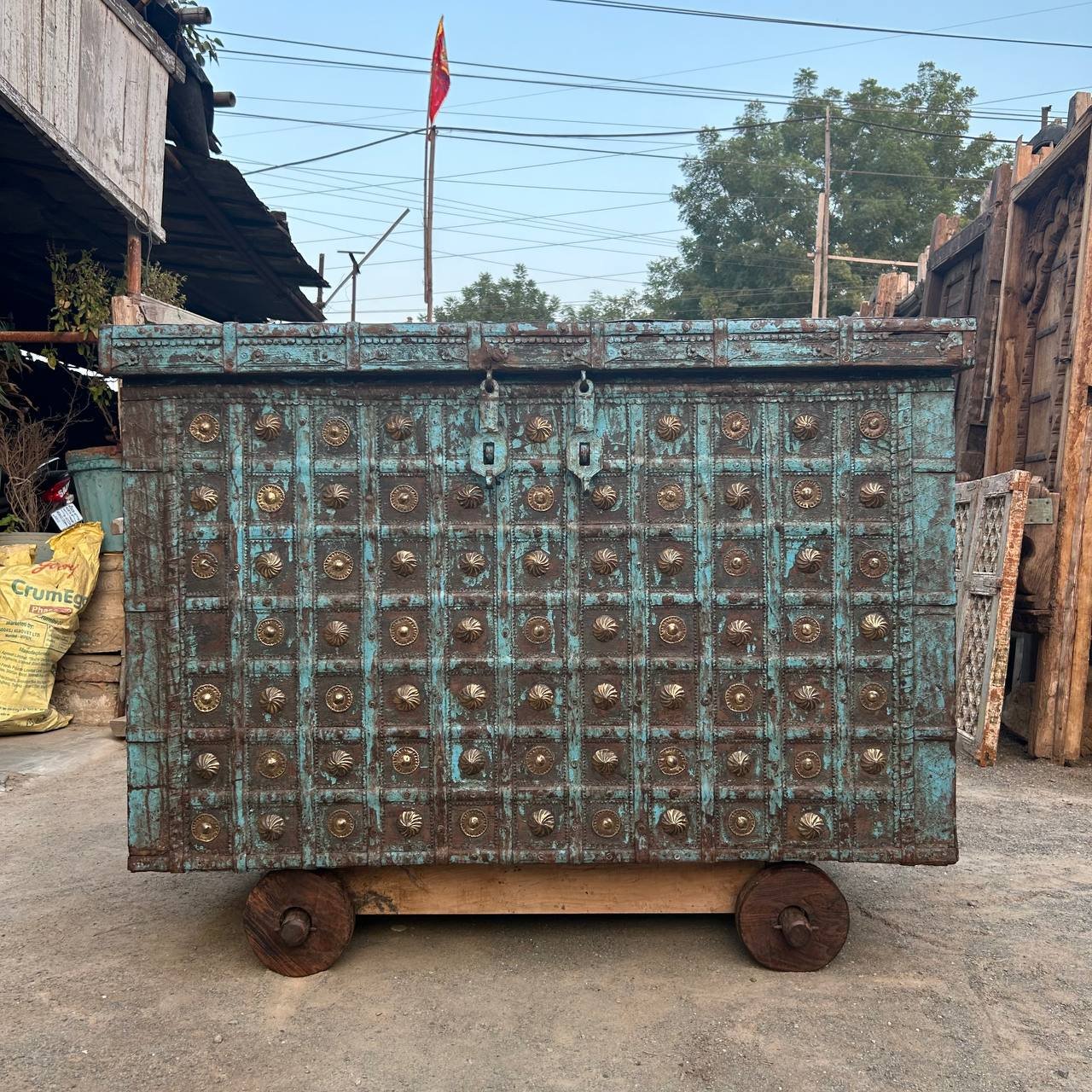 This large antique Indian metal bound Dowry chest on wheels, with an arched top with dual heavy metal engraved locks, riveted strapwork with embossed patterned borders and serrated edging, rosette studwork, and mythological symbols of birds and animals to the front, raised on timber wheels hidden behind shaped timber panels,
