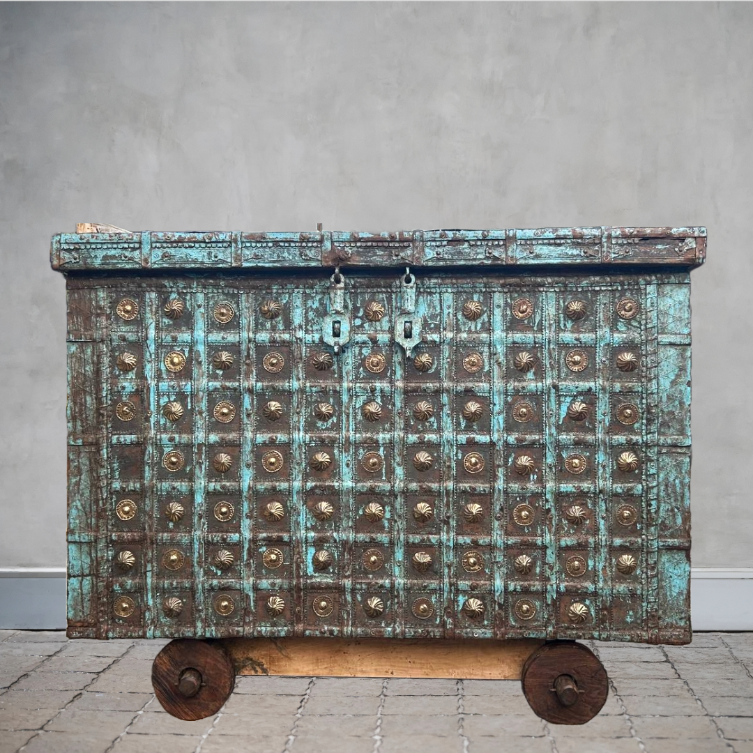 A large antique traditional Indian Trunk known as a Pitara Chest, meaning Treasure Chest (or more literally ‘a box full of treasures’ in Hindi). These Pitara Trunk were traditionally used to store a families treasures – from jewellery, manuscripts and silks to family heirlooms, and often containing secret compartments.