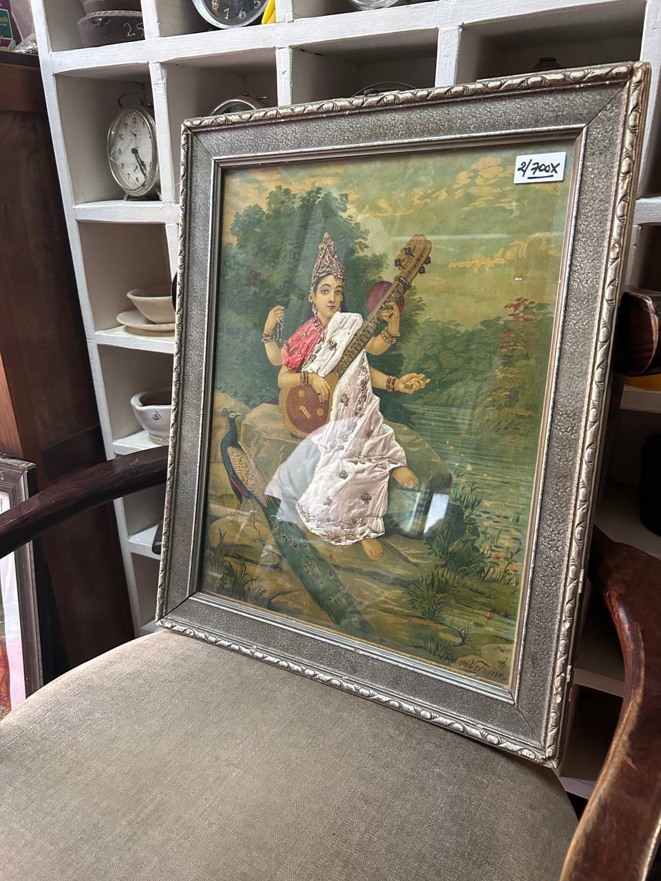 Elevate your space with this stunning vintage print of Goddess Saraswati, the Hindu deity of knowledge, music, and arts, playing the Veena, a traditional Indian stringed instrument. Measuring 55 cm x 44 cm, this exquisite reproduction is a masterpiece by the legendary Indian artist, Raja Ravi Varma.