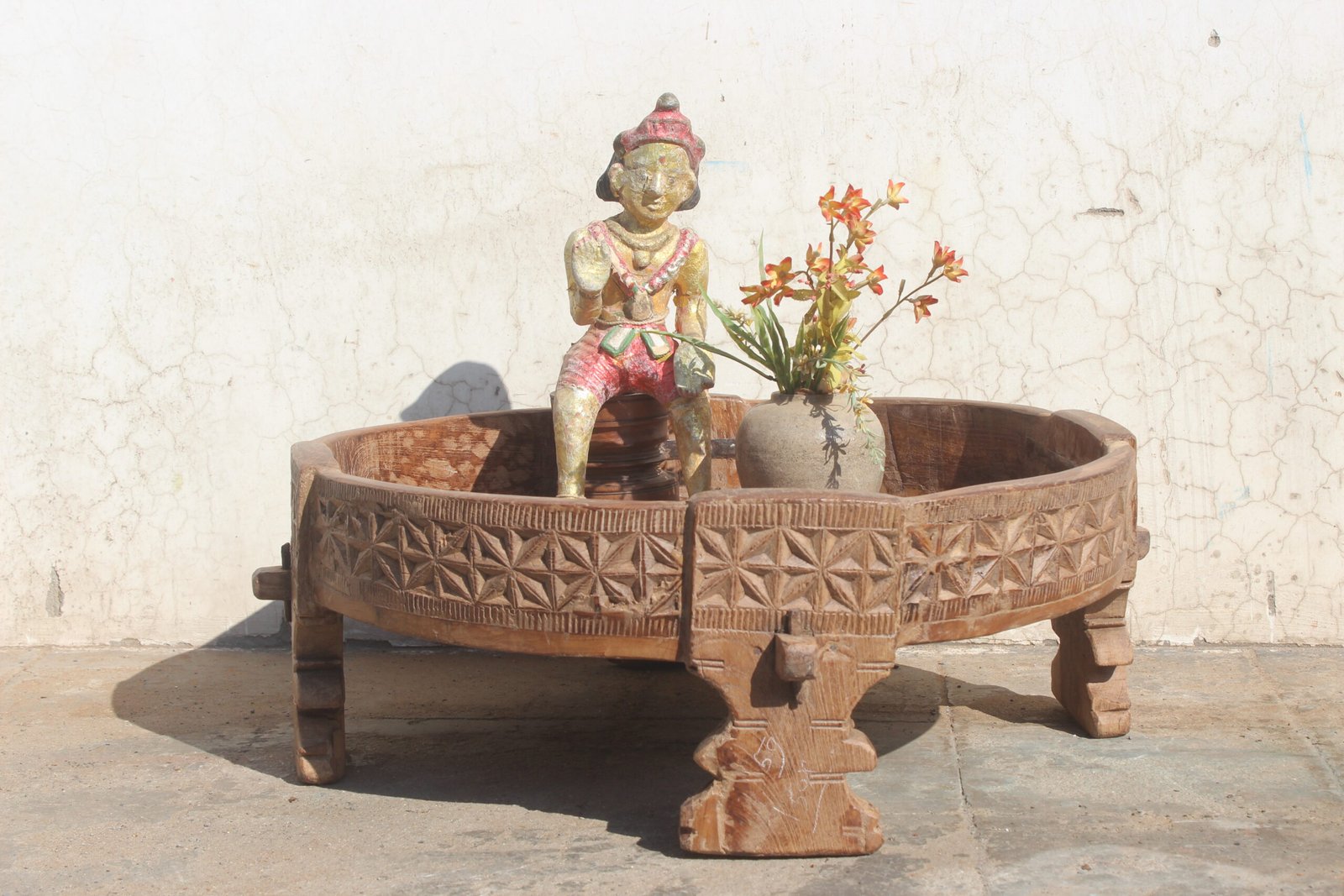 Indian Carved Chakki Table, Coffee Table, Vintage Indian Grinder Table