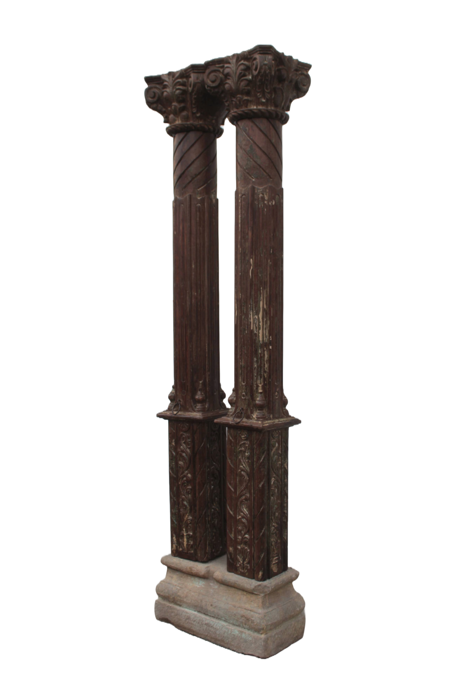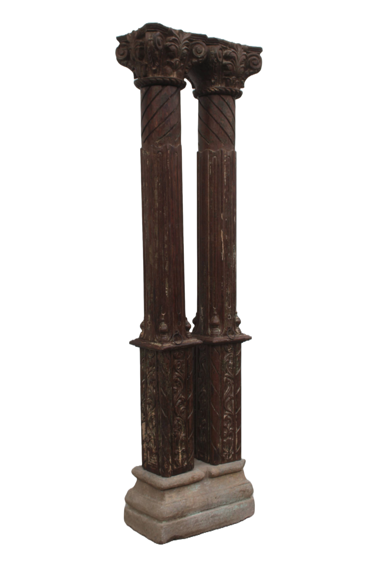Original carved teak and stone pillars from India (Rajasthan). Age 200 yrs. Intricate detailed carving around the top of these column pillars. A perfect addition to a new or existing home. Can be used functionally or as an art piece alone. Finished in a light brown wax. Very unique.