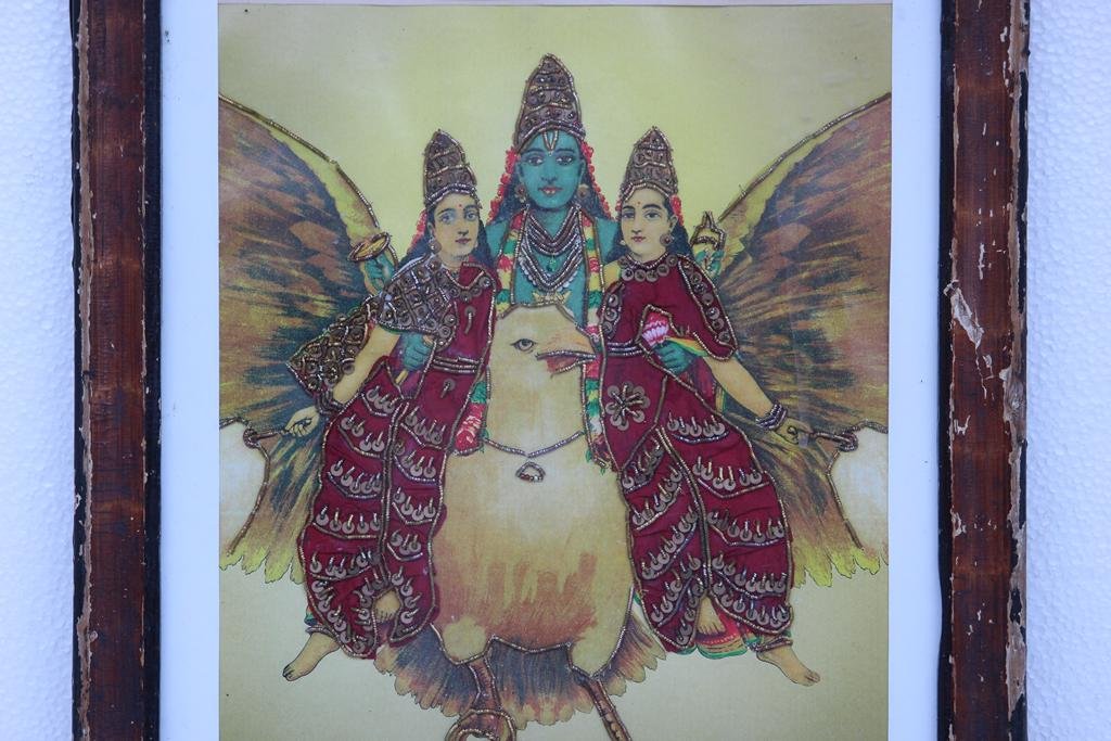 Old Original Ravi Varma Cotton Work Print Vishnu Laxmi Saraswati Garud Vahanam