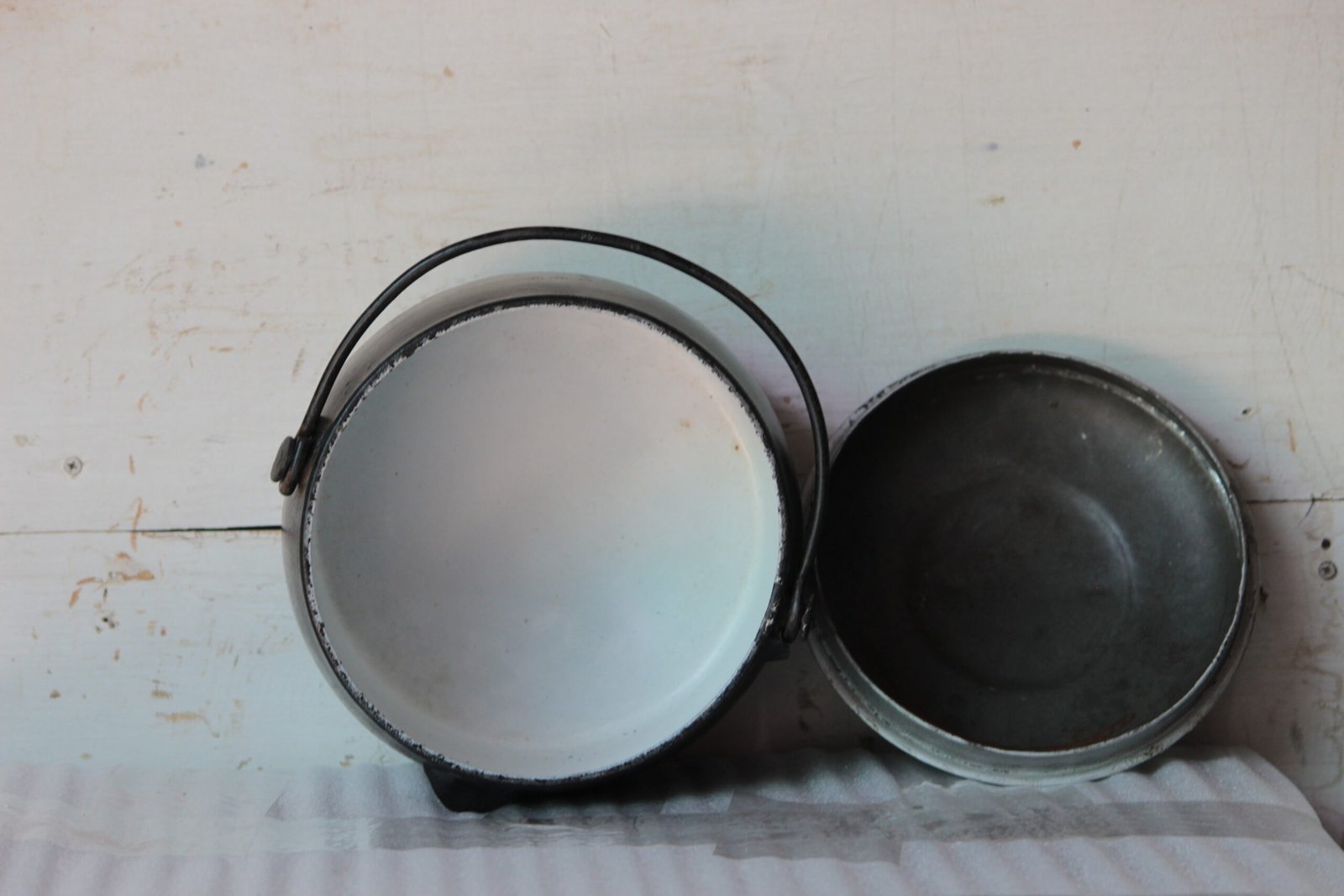 A traditional cast iron pot featuring a sturdy handle, sleek black exterior and a white enamel interior. It is ideal for use over a live fire and is designed to cook a variety of traditional dishes.