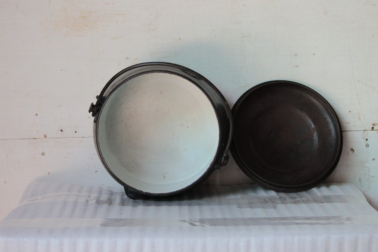 A traditional cast iron pot featuring a sturdy handle, sleek black exterior and a white enamel interior. It is ideal for use over a live fire and is designed to cook a variety of traditional dishes.