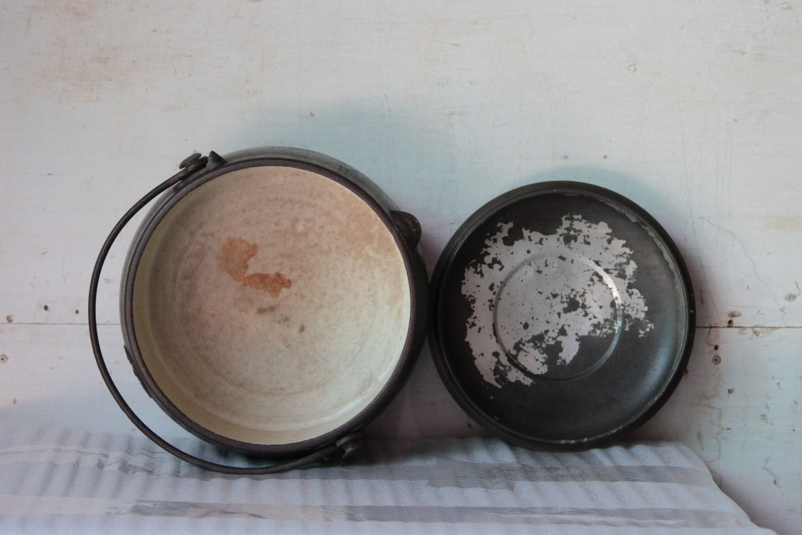 A traditional cast iron pot featuring a sturdy handle, sleek black exterior and a white enamel interior. It is ideal for use over a live fire and is designed to cook a variety of traditional dishes.