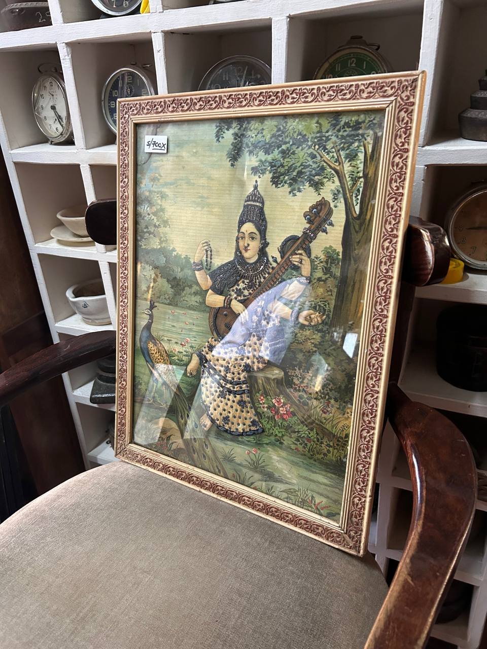 Add a touch of elegance and cultural sophistication to your space with this exquisite vintage print of Goddess Sarasvati, the Hindu deity of knowledge, music, and arts, playing the Veena. Measuring 54 cm x 41 cm, this stunning reproduction is a masterpiece by the legendary Indian artist, Raja Ravi Varma.