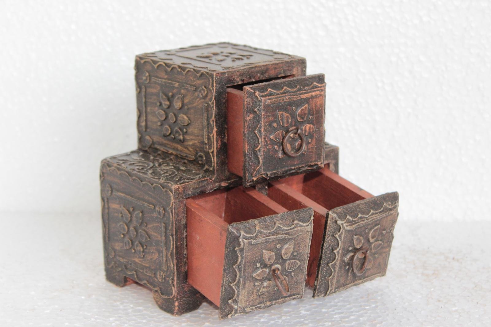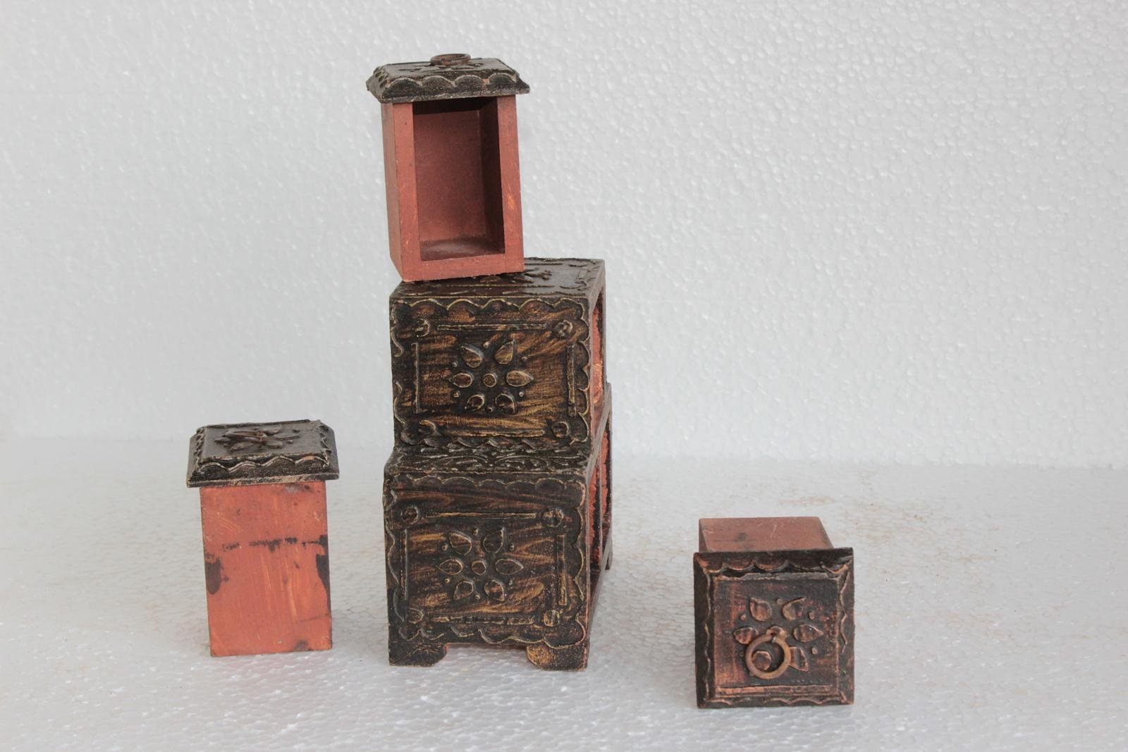 Each drawer is beautifully detailed with floral and geometric motifs, painted by hand to reflect the character and color of classic Indian decor. Ideal for storing jewelry, keepsakes, or small essentials, it serves as both a functional storage solution and a decorative statement piece.