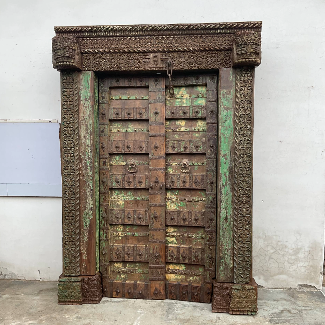 This beautifully hand carved antique doors and its ornate doorframe hails from India. Rich with history and detail, this Teak wood old door belonged to an ancestral “Haveli” mansion from the 1880s.