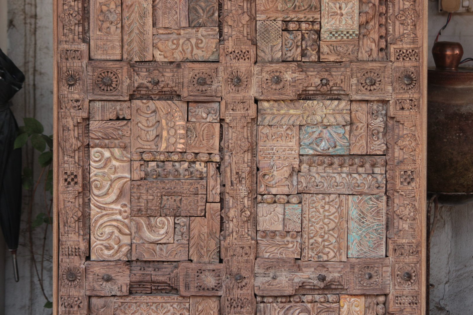 Iconography & Motifs: The carvings are rich with traditional Indian and Hindu motifs, including complex floral scrolls, mythological figures, traditional geometric jali patterns, and protective circular sun and rosette designs.