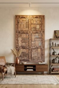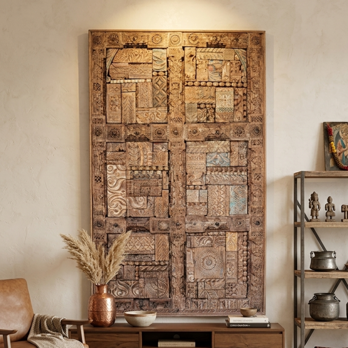 This exceptional 5.3-foot (63.6 inches) tall wall decor panel is a curated fusion of history, craftsmanship, and sustainable luxury. Meticulously constructed using an array of antique, hand-carved fragments salvaged from historical Indian homes, Havelis, doors, columns, and windows, this one-of-a-kind wall panel carries a soulful resonance that modern, mass-produced art cannot replicate. It is designed for those who seek to anchor a room with a sense of permanence, architectural scale, and global heritage.