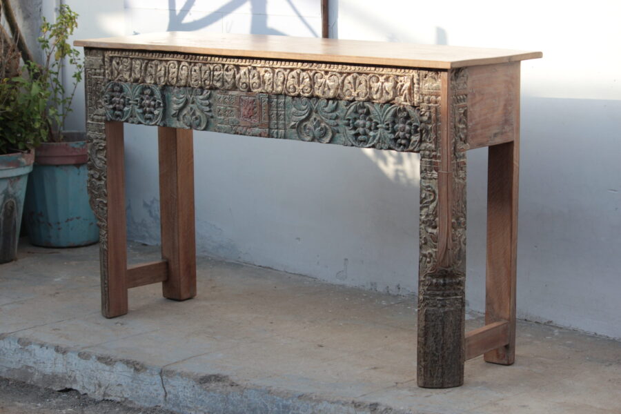 This console utilizes old architectural elements, re-claimed woods and is handcrafted by artisans using basic hand tools.
