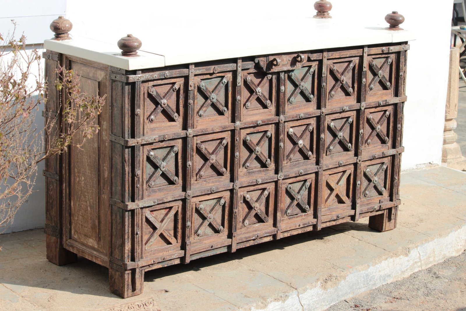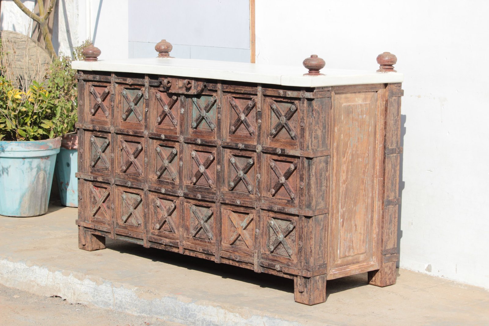 This antique dowry chest, hailing from Gujarat in the 19th century, boasts the unique kothla majus style of India. Crafted from luxurious teak wood, its depth has been reduced, making it a practical and eye-catching Console Table for modern living. This one-of-a-kind Table represents the distinctive design of India’s Gujarat province and was originally used to store valuable items and opulent fabrics, often presented as part of a bride’s dowry to her new husband’s parents.