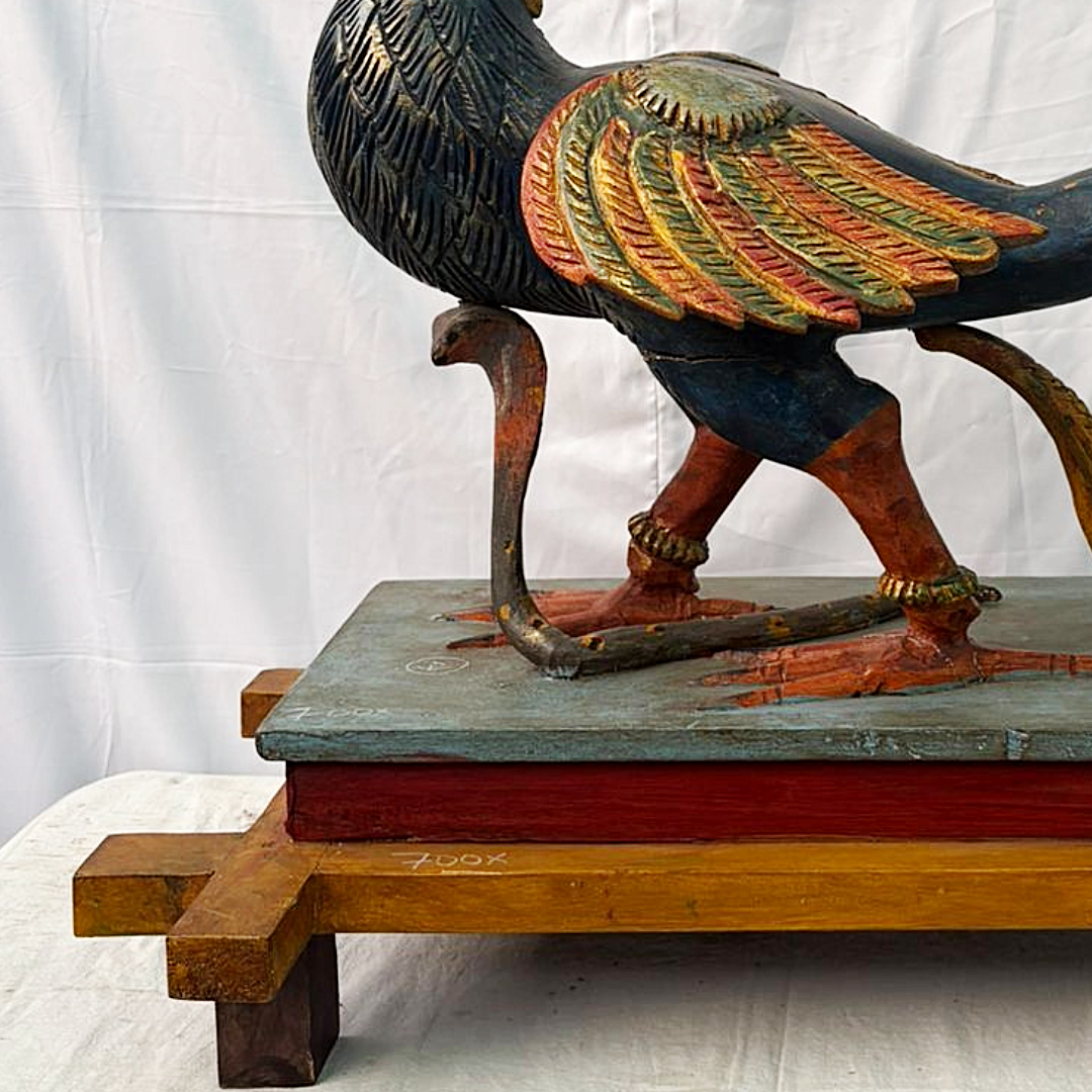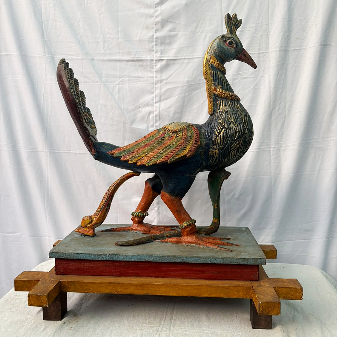 Celebrate spirituality and artistry with this handcrafted wooden peacock vahana, the divine vehicle of Lord Murugan.